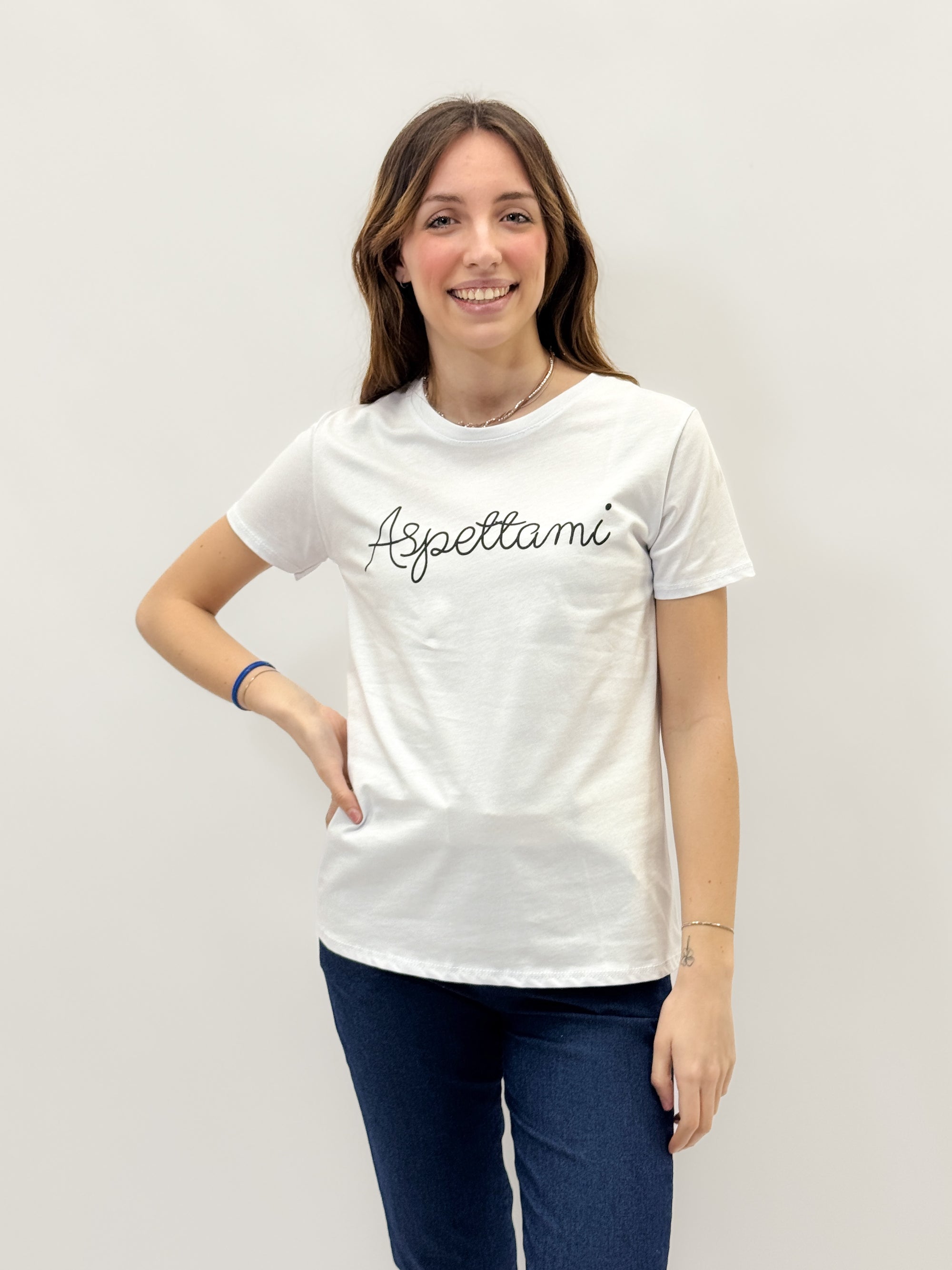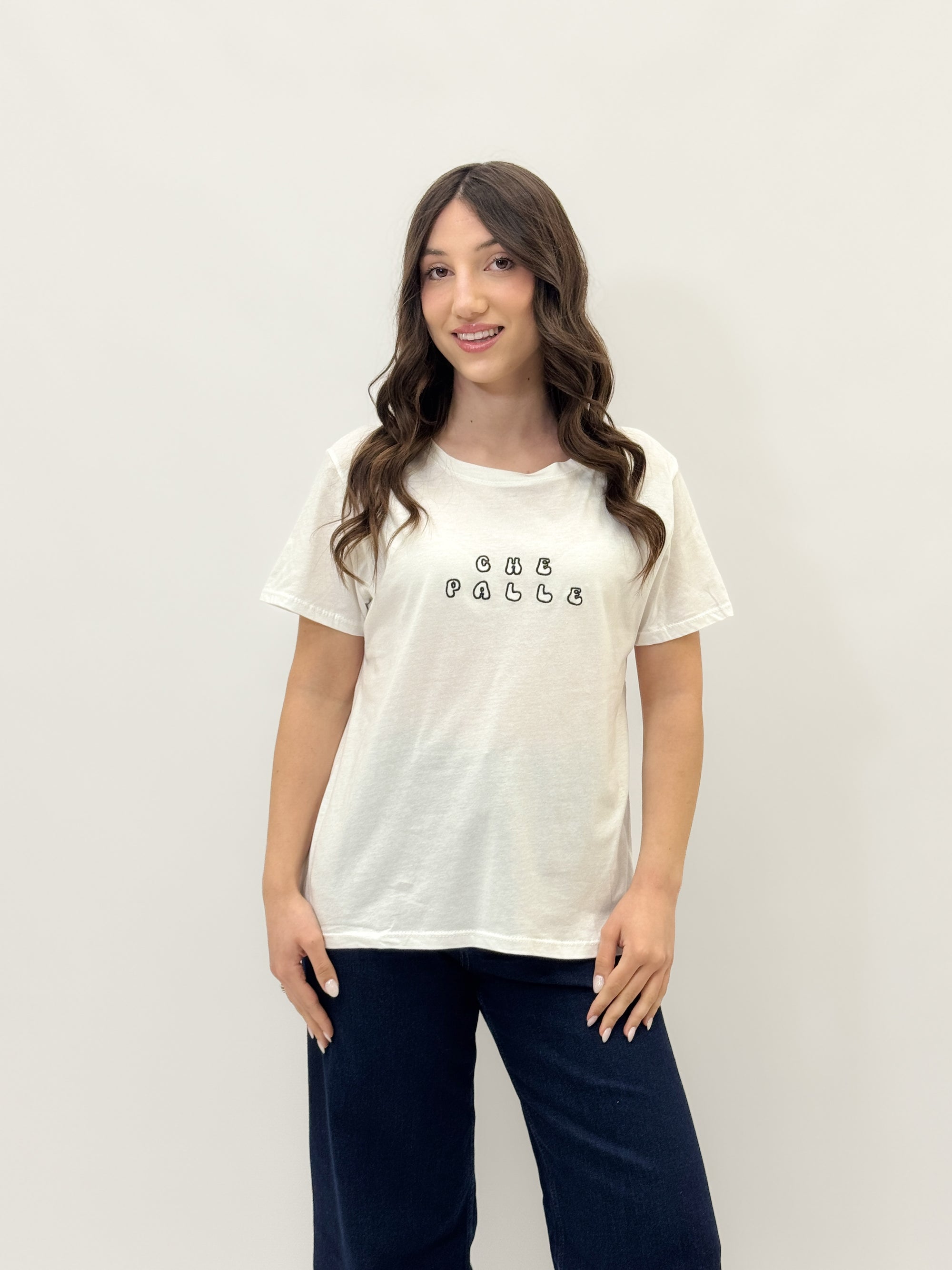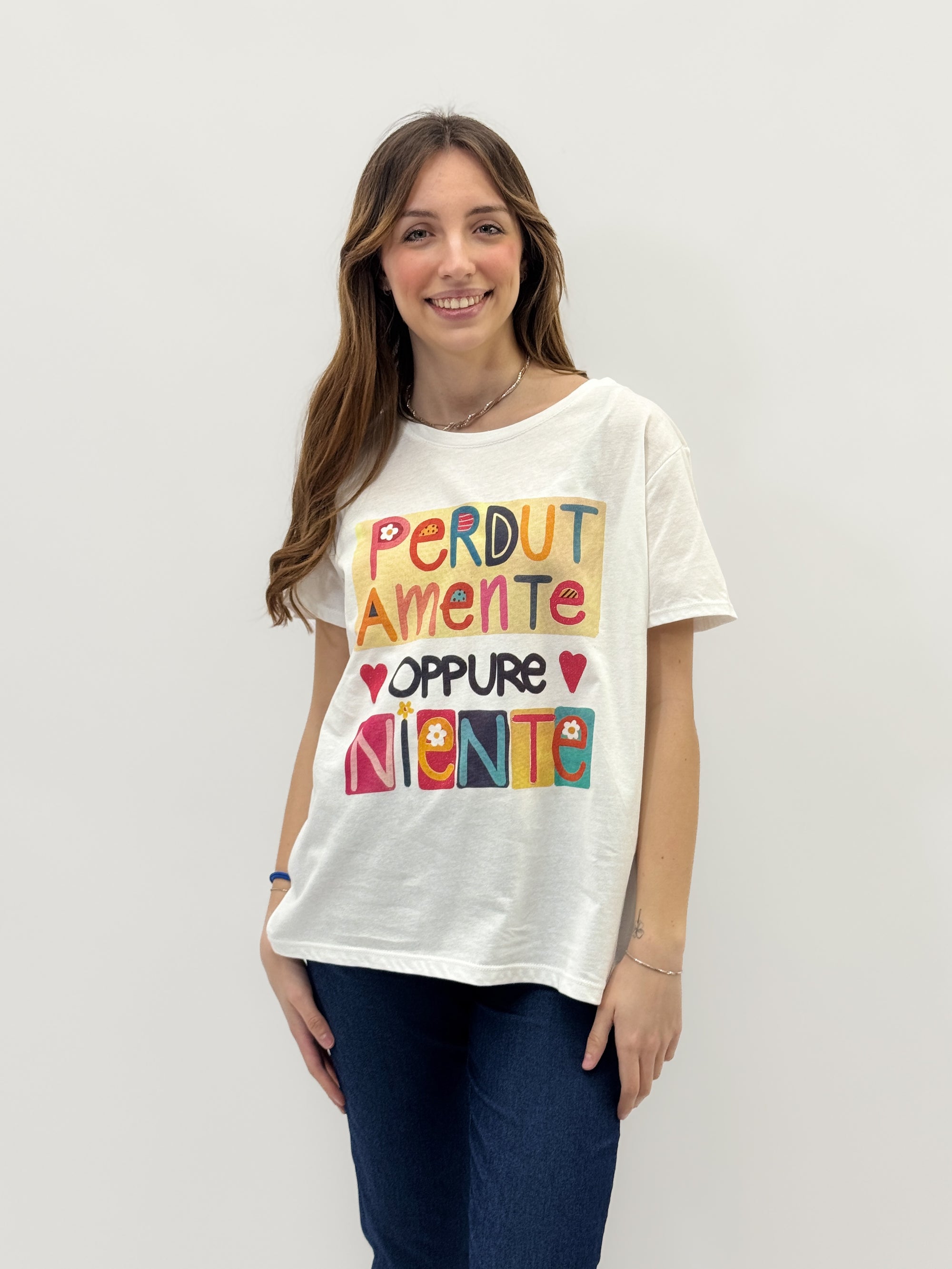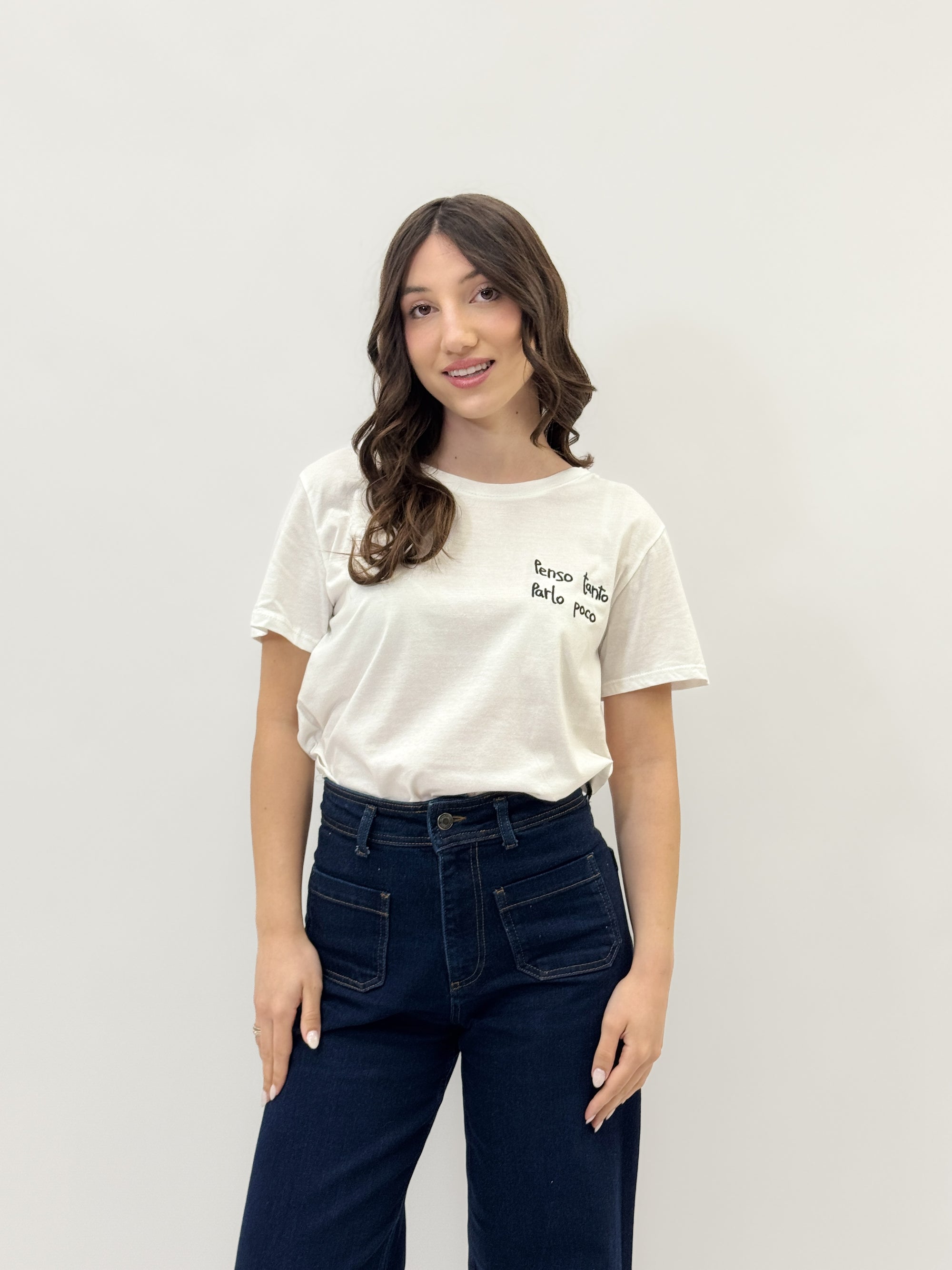 T-shirt in cotone con scritto "Penso tanto parlo poco"