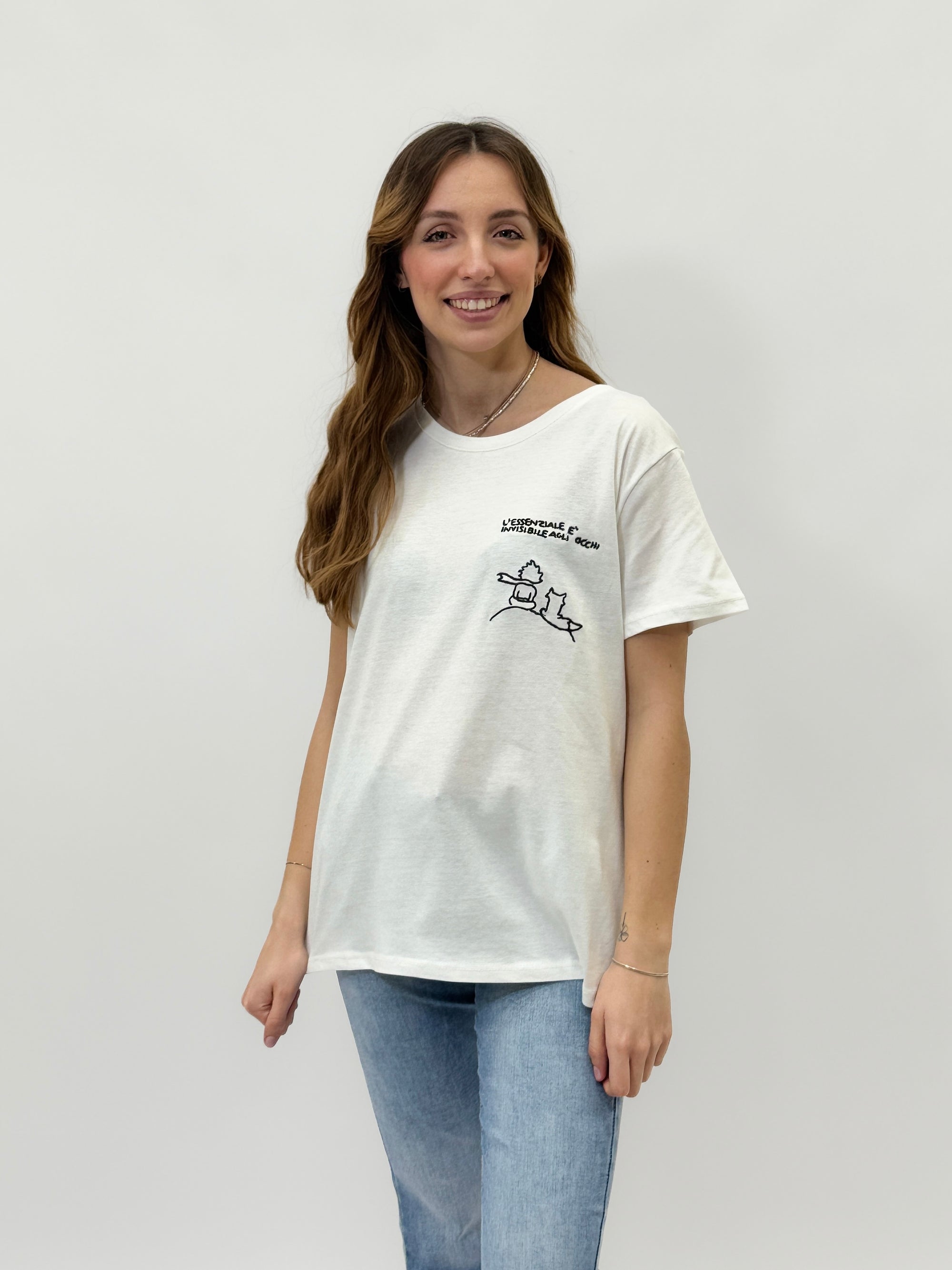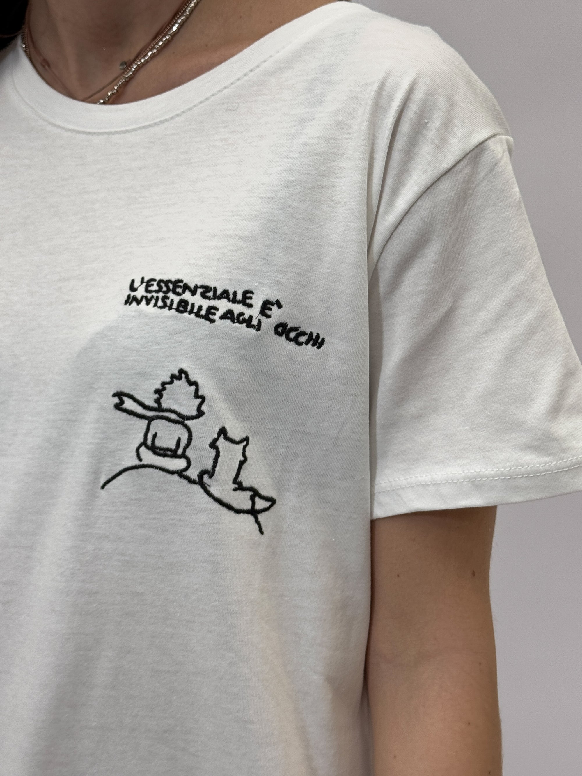 T-shirt con scritta "l'essenziale è invisibile agli occhi"