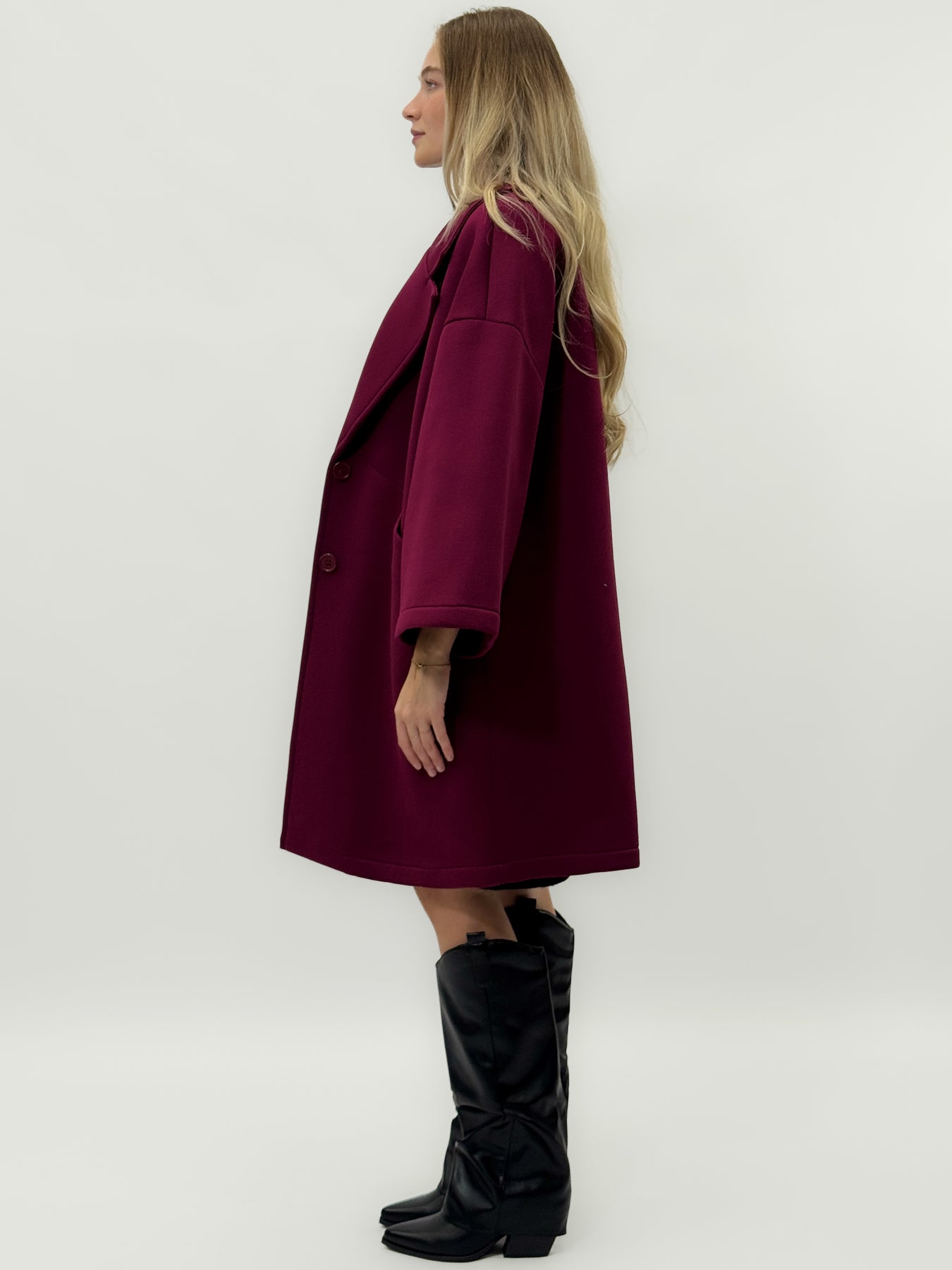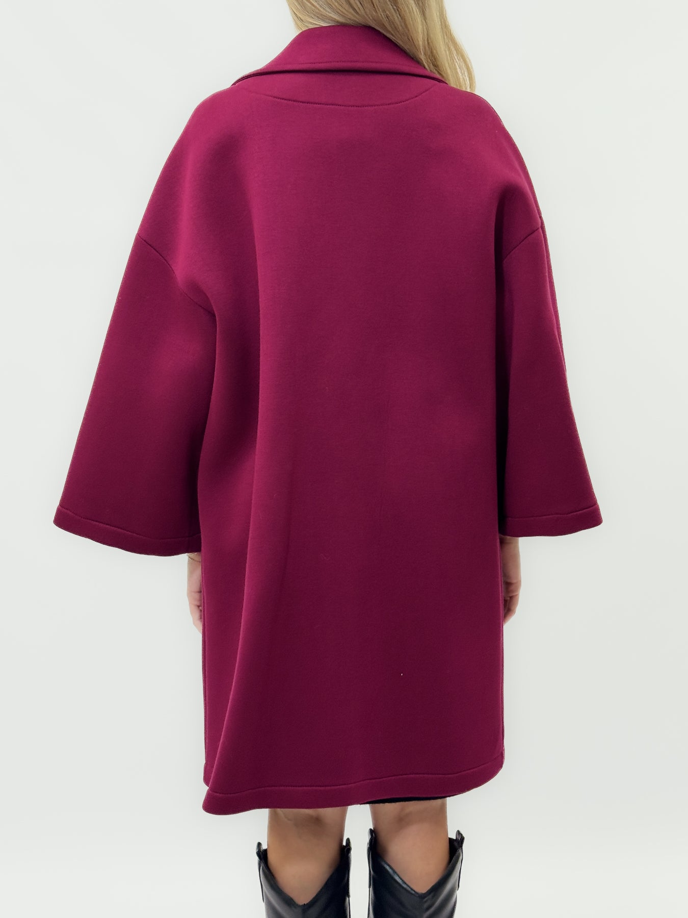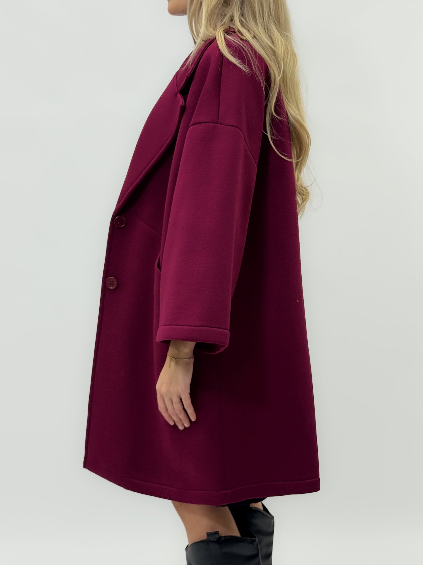 Il design oversize con revers ampi, chiusura frontale con bottoni e tasche laterali lo rendono un capo pratico e raffinato, perfetto per completare look casual chic o più eleganti. Il colore bordeaux intenso dona carattere e unicità al tuo outfit.