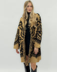 Cappotto in maglia jacquard con motivo decorativo a contrasto, impreziosito da frange lungo i bordi che donano un tocco boho e raffinato.