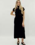 Completo due pezzi in morbida viscosa elasticizzata, composto da maglia a mezza manica con collo alto e gonna lunga a linea svasata.