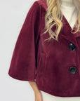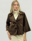 Giacca corta con ampio revers e maniche a 3/4, realizzata in tessuto morbido effetto scamosciato che dona un look raffinato e contemporaneo.