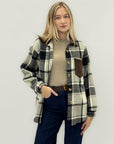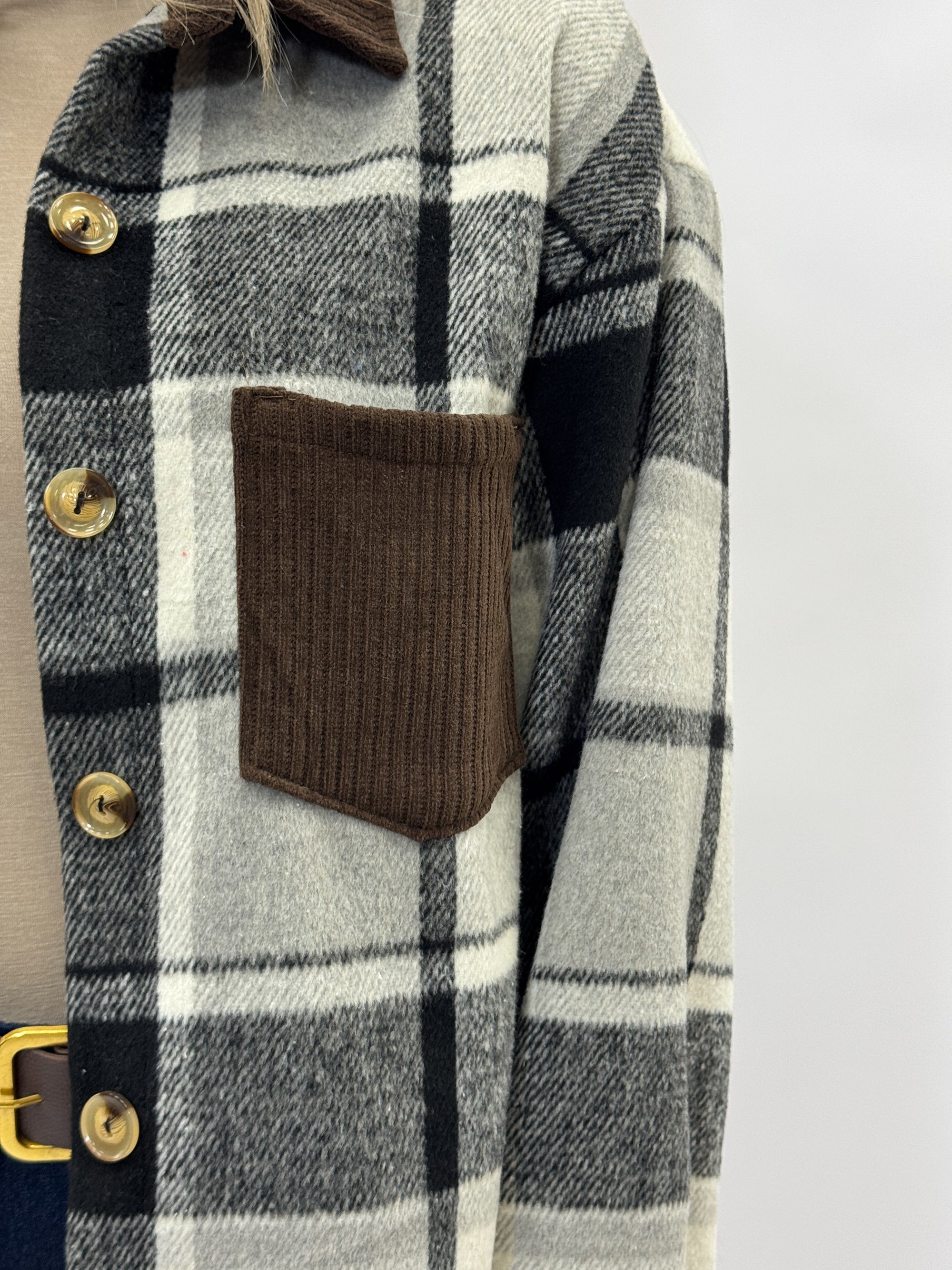 Camicia oversize in caldo misto lana, con motivo a quadri e taschino in velluto a contrasto.