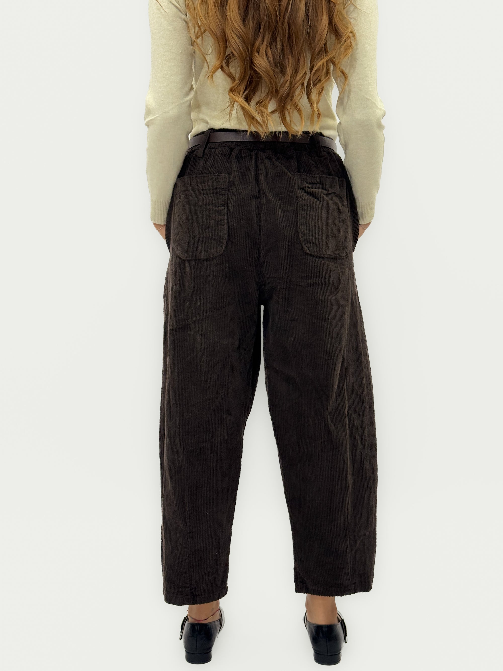 Pantaloni dal taglio ampio e rilassato, realizzati in velluto a coste leggero e caldo, perfetti per la stagione autunnale e invernale.